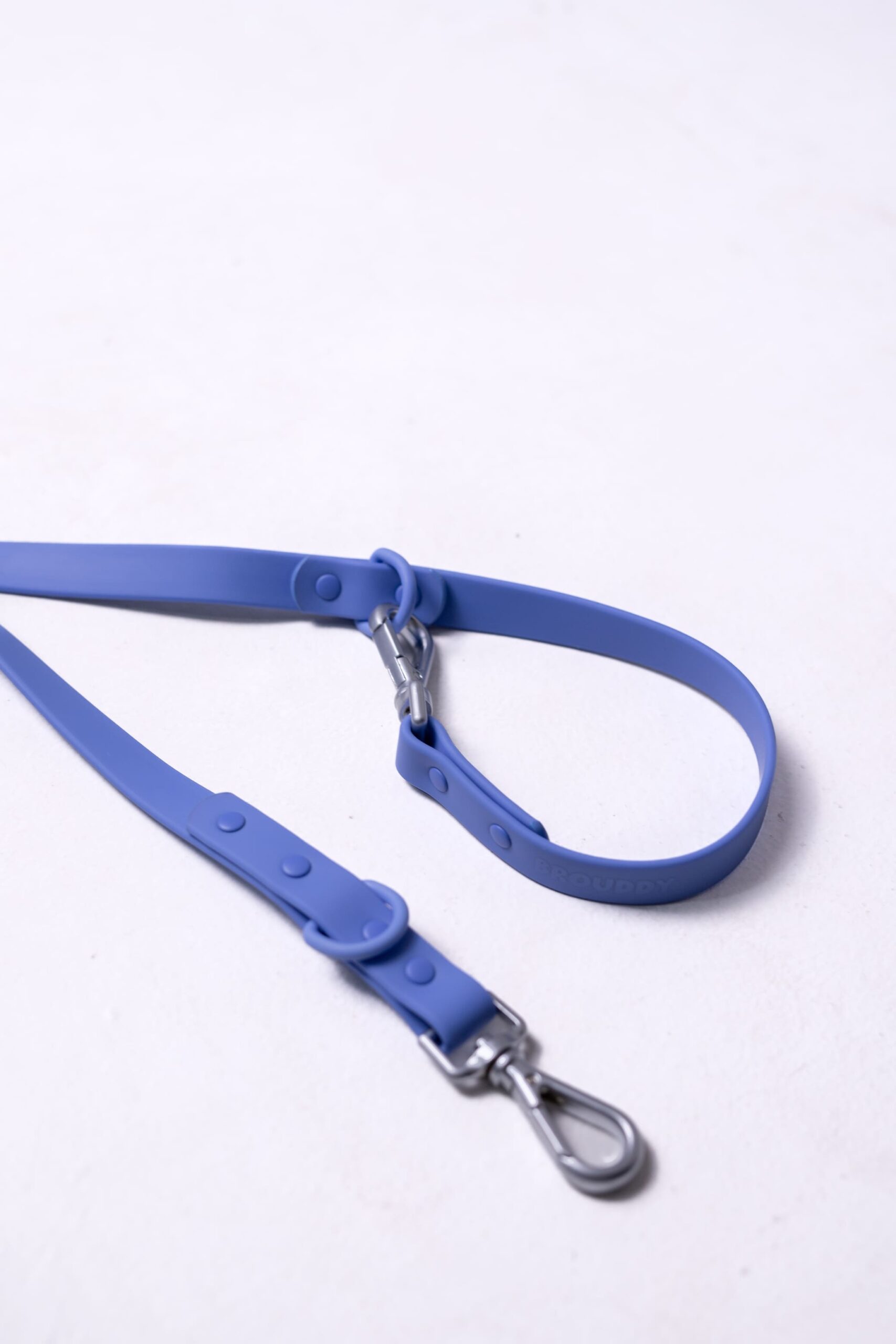 - Correa y Collar: Correa de tejido de nailon recubierta de PVC, anilla en D de acero al carbono recubierta
